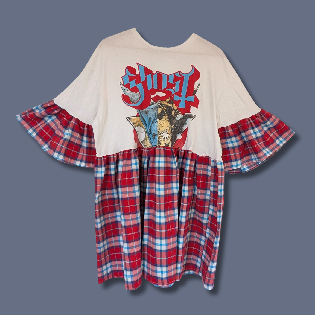 Reworked and Pre-loved Ghost T-Shirt, reworked into a Smock Dress featuring a Red, White and Blue Tartan Fabric.