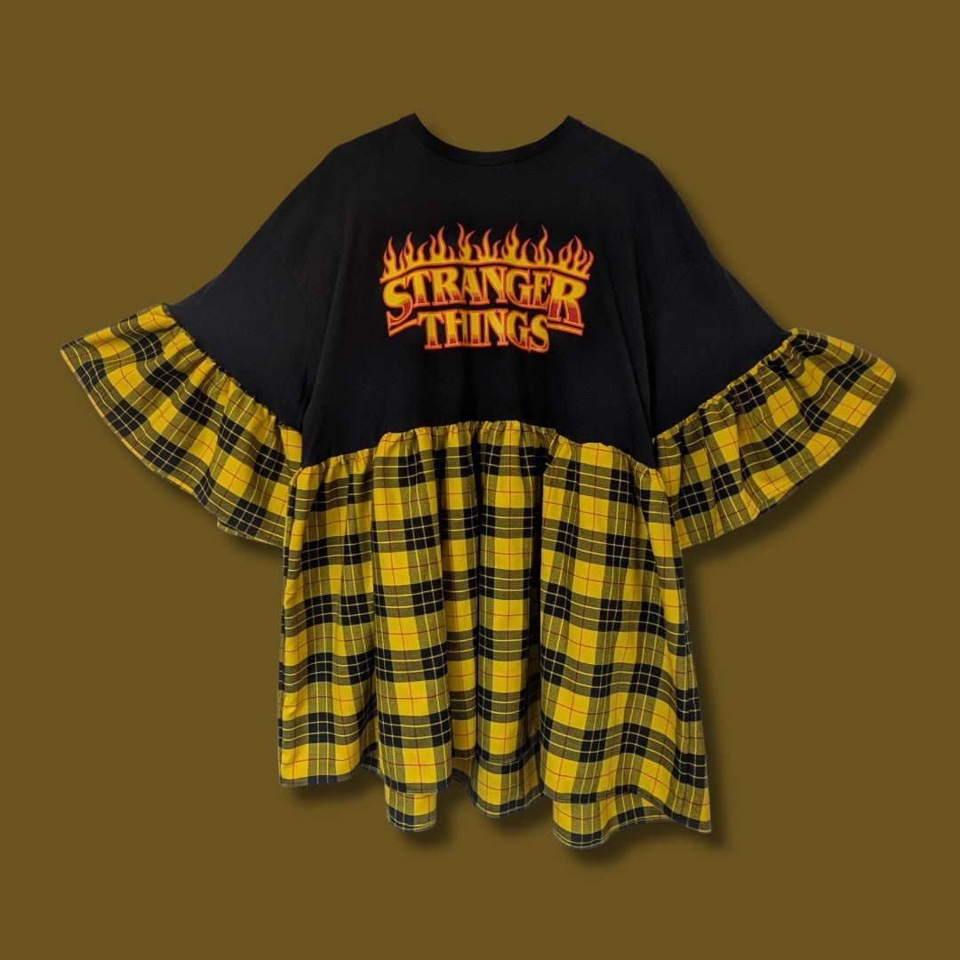 Reworked & Pre-loved Stranger Things T-Shirt, reworked into a Smock Dress featuring a Yellow, Black and Red Tartan Fabric.